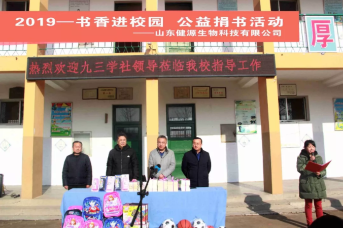 一本書傳遞一份愛,一份愛成就一個夢想,一個夢想讓無限希望起航,愛心就像一個蒲公英,和著暖陽來到了校園。元旦將至,歲寒情深,2019年12月27日,九三學社與山東健源生物科技有限公司共同為泰安市高新區(qū)化馬灣小學捐贈了一批書籍、學習用品和體育器材,為學生和老師們送去社會的關心、關懷和關愛。