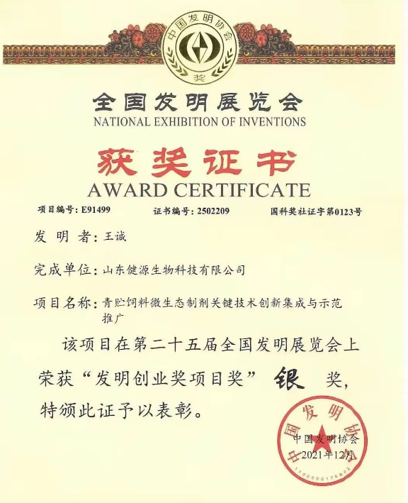 會議期間舉行全國發(fā)明展覽會“發(fā)明創(chuàng)業(yè)獎項目獎”頒獎典禮,山東健源生物科技有限公司申報的“青貯飼料微生態(tài)制劑關鍵技術創(chuàng)新集成與示范推廣”項目,受到專家評委的肯定,在眾多發(fā)明中脫穎而出,榮獲“發(fā)明創(chuàng)業(yè)獎項目獎”銀獎。