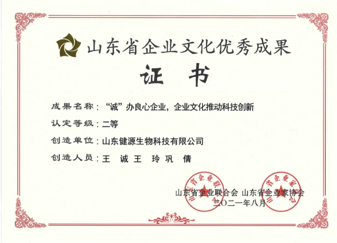 2021年8月,山東省企業(yè)聯(lián)合會(huì)、山東省企業(yè)家協(xié)會(huì)發(fā)布《關(guān)于公布首屆山東省企業(yè)文化成果的通知》,山東健源生物科技有限公司報(bào)送的““誠”辦良心企業(yè),企業(yè)文化推動(dòng)科技創(chuàng)新”企業(yè)文化建設(shè)成果榮獲首屆山東省企業(yè)文化成果二等獎(jiǎng)。