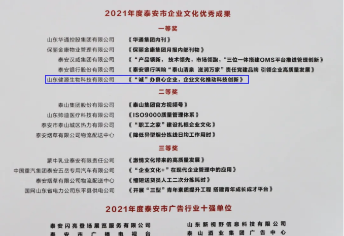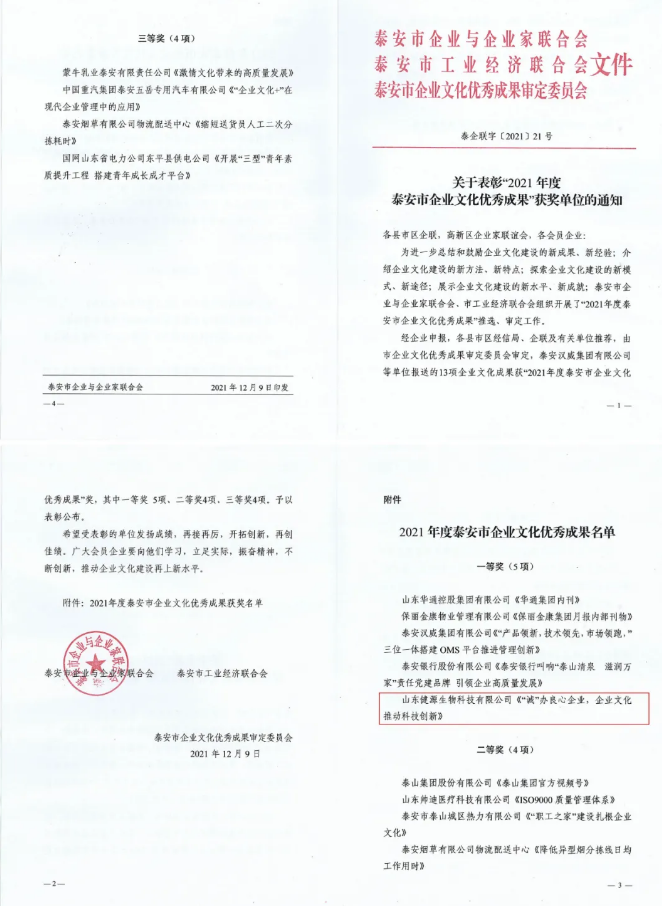 熱烈祝賀山東健源生物榮獲2021年度泰安市企業(yè)文化優(yōu)秀成果一等獎(jiǎng)、山東省企業(yè)文化優(yōu)秀成果二等獎(jiǎng)