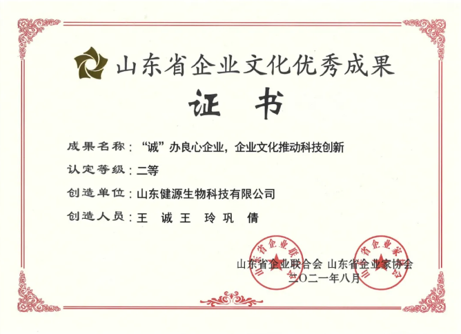 2021年8月,山東省企業(yè)聯(lián)合會(huì)、山東省企業(yè)家協(xié)會(huì)發(fā)布《關(guān)于公布首屆山東省企業(yè)文化優(yōu)秀成果的通知》,山東健源生物科技有限公司報(bào)送的““誠(chéng)”辦良心企業(yè),企業(yè)文化推動(dòng)科技創(chuàng)新”企業(yè)文化建設(shè)成果榮獲首屆山東省企業(yè)文化優(yōu)秀成果二等獎(jiǎng)。