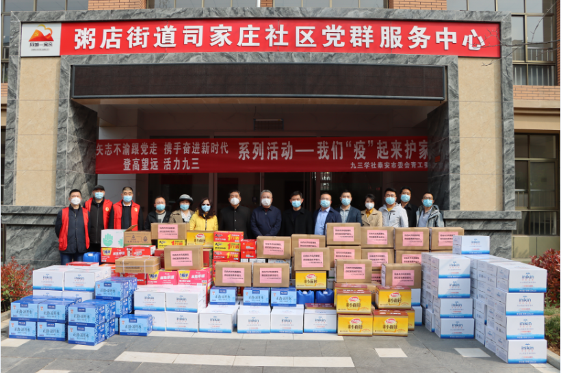 2022年4月2號上午,九三學(xué)社泰安市委會青工委集結(jié)社員,組織開展了“矢志不渝跟黨走、攜手奮進新時代——我們‘疫’起來護家”愛心捐贈活動,助力疫情防控。社員們先后來到岱岳區(qū)天平街道辦事處、粥店辦事處司家莊社區(qū)、泰山區(qū)省莊鎮(zhèn)東羊樓村等基層地點,看望慰問了在一線工作的防疫人員,并為他們送去醫(yī)用口罩48000只、消毒液320斤、75°酒精320斤、方便面110箱、礦泉水285箱、火腿腸、肉丸、面包等若干愛心物資,總價值五萬余元,山東健源生物科技有限公司王誠董事長作為九三學(xué)社泰安市直機關(guān)基層委員會六支社主委代表公司參與此次愛心捐贈活動。