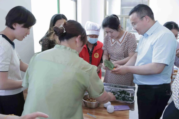 與村民共同包粽子迎端午,綠色的粽葉在大家手中上下舞動,清香的葦葉包裹真意,點綴一顆甜甜的真心,用長長的棉線牢牢捆住真情。