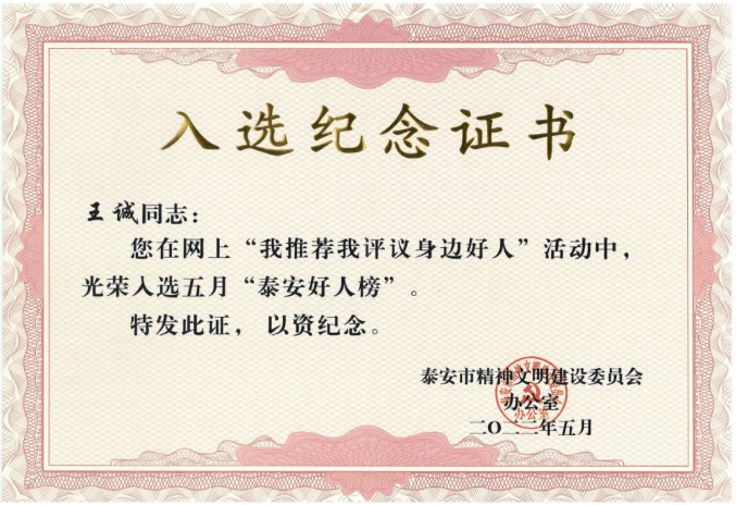 一、王誠董事長(zhǎng)光榮入選五月“泰安好人榜”——由泰安市精神文明建設(shè)委員會(huì)頒發(fā)