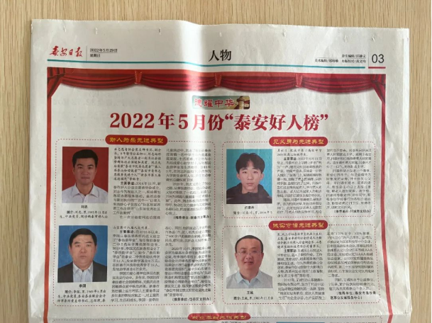 《泰安日?qǐng)?bào)》發(fā)布2022年5月份“泰安好人榜”