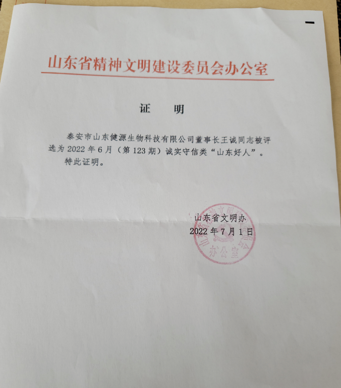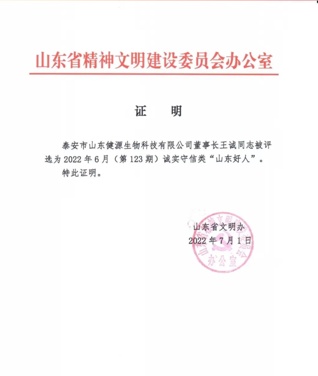 為深入貫徹落實(shí)黨的十七屆六中全會(huì)精神,推動(dòng)學(xué)雷鋒活動(dòng)常態(tài)化,推進(jìn)公民思想道德建設(shè),公民道德素質(zhì)和社會(huì)文明程度,努力建設(shè)“美德山東”,根據(jù)省委辦公廳《關(guān)于深入開展學(xué)雷鋒活動(dòng)的實(shí)施意見》(魯辦發(fā)[2012]6號(hào))精神,在全省廣泛開展“山東好人——每周之星”評(píng)選活活動(dòng)由省委宣傳部、省文明辦、大眾報(bào)業(yè)集團(tuán)、省總工會(huì)、團(tuán)省委、省婦聯(lián)、山東廣播電視臺(tái)聯(lián)合主辦。山東健源生物科技有限公司王誠董事長(zhǎng)被評(píng)選為2022年6月(123期)誠實(shí)守信類“山東好人”。
