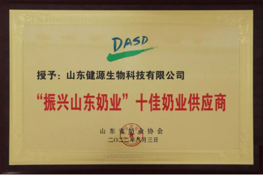 山東健源生物科技有限公司榮獲“振興山東奶業(yè)”十佳奶業(yè)供應(yīng)商 稱號(hào)
