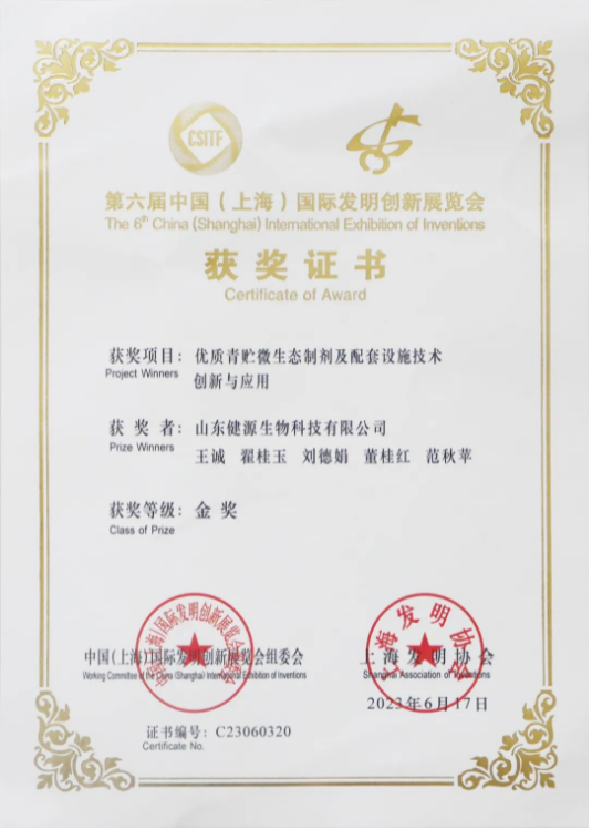 山東健源生物榮獲第六屆中國(上海)國際發(fā)明創(chuàng)新展覽會金獎