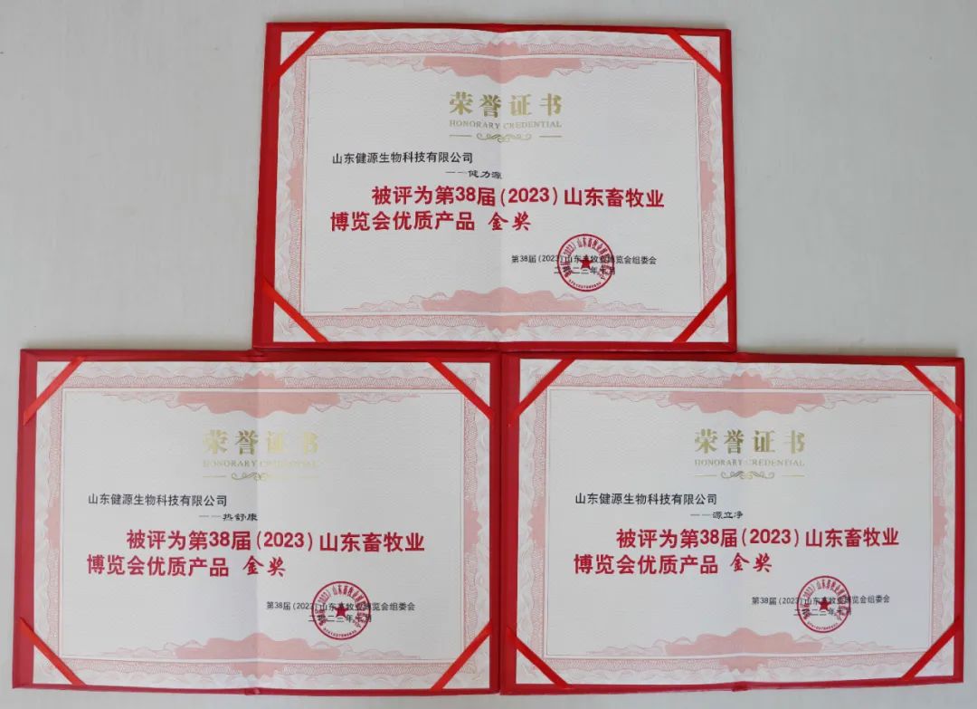 會上對獲獎單位進(jìn)行頒獎,健源生物產(chǎn)品“健力源”、“源立凈”、“熱舒康”,均被評為第38屆(2023)山東畜牧業(yè)博覽會優(yōu)質(zhì)產(chǎn)品金獎。