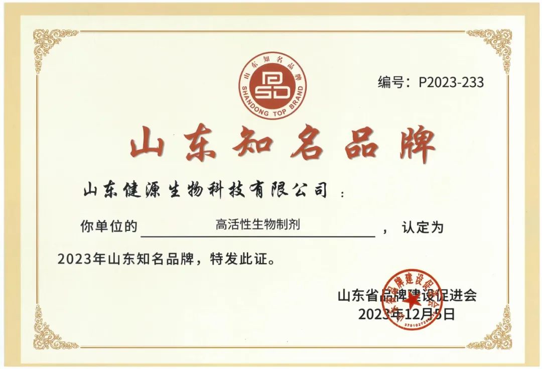 近日,由山東省品牌建設(shè)促進(jìn)會(huì)、大眾報(bào)業(yè)集團(tuán)、山東廣播電視臺(tái)、鳳凰網(wǎng)主辦的“品勢(shì)向新 數(shù)智賦能”2023年山東品牌年會(huì)在濟(jì)南成功舉辦。會(huì)上,2023年山東知名品牌認(rèn)定名單重磅發(fā)布,山東健源生物科技有限公司健源高活性生物制劑被認(rèn)定為2023年山東知名品牌。