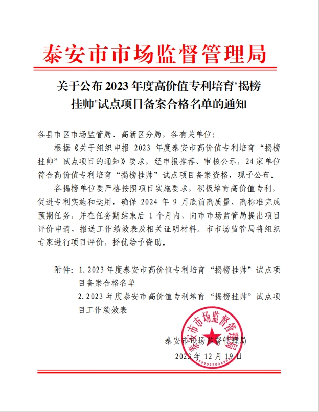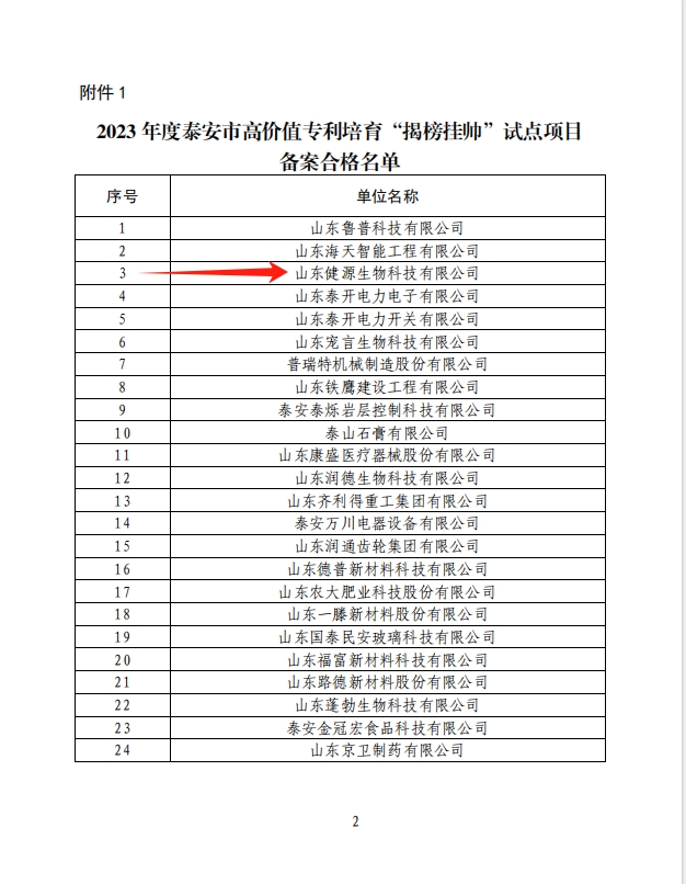 日前,泰安市市場監(jiān)督管理局根據(jù)《關(guān)于組織申報2023年度泰安市高價值專利培育“揭榜掛帥”試點項目的通知》要求,經(jīng)過申報推薦、審核公示,我市24家單位符合備案資格。山東健源生物科技有限公司成功入選2023年度高價值專利培育“揭榜掛帥”試點項目備案合格名單。