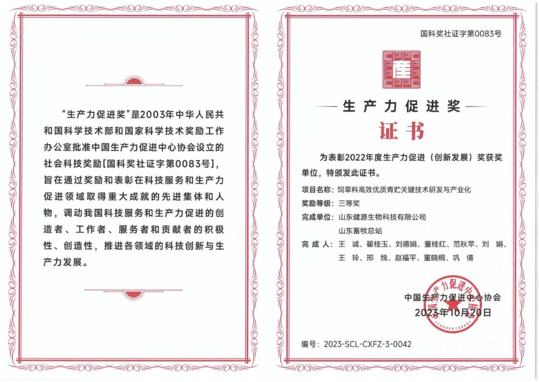 12月9日,2023中國生產(chǎn)力促進中心協(xié)會年會暨第十六屆寰宇生產(chǎn)力論壇生產(chǎn)力創(chuàng)新發(fā)展大會在北京成功召開,山東健源生物科技有限公司“飼草料高效優(yōu)質(zhì)青貯關(guān)鍵技術(shù)研發(fā)與產(chǎn)業(yè)化”項目榮獲2022年度生產(chǎn)力促進(創(chuàng)新發(fā)展)獎三等獎。