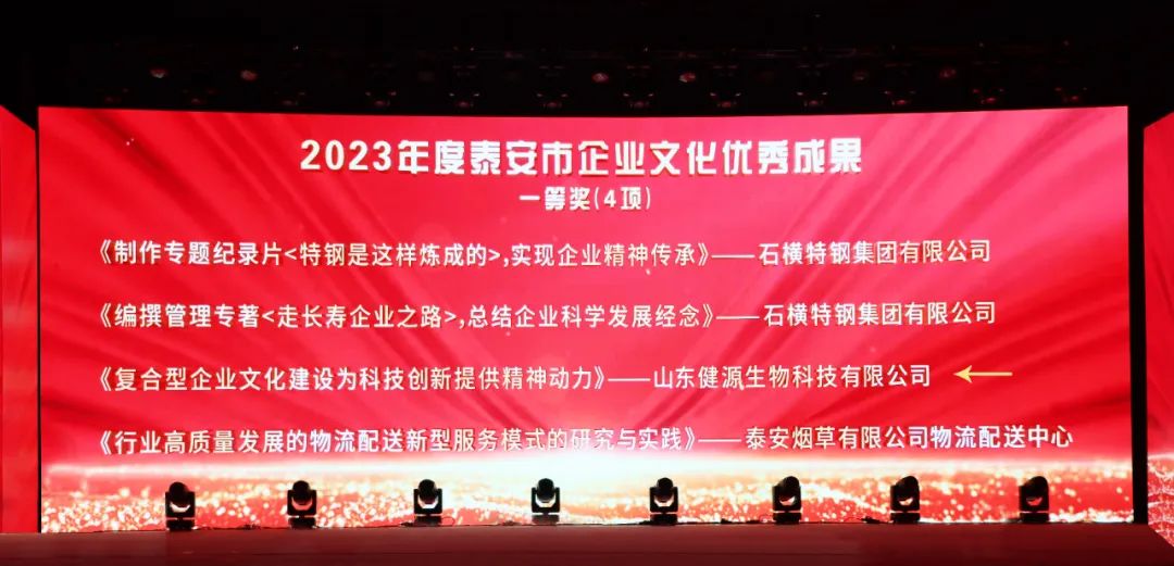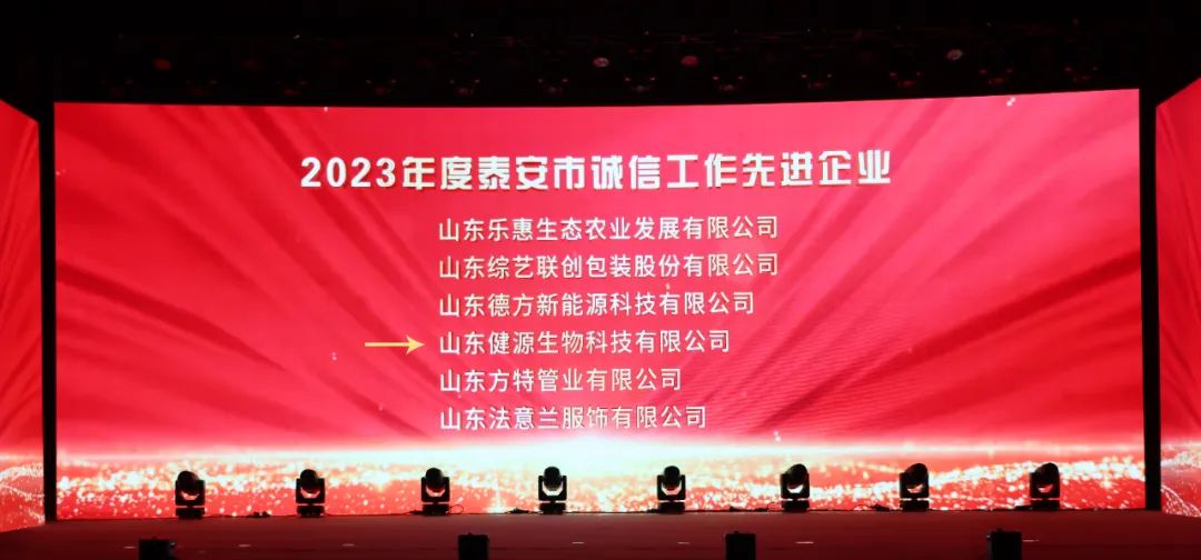 12月29日,2023迎新年銀企聯(lián)誼會暨2023年泰山企業(yè)家、泰安市“誠信工作先進企業(yè)”、 泰安市踐行社會責任愛心企業(yè)頒獎盛典隆重舉行。大會總結(jié)交流全市推進新型工業(yè)化和企業(yè)創(chuàng)新發(fā)展的成就與經(jīng)驗,表彰先進。山東健源生物科技有限公司榮獲“泰安市企業(yè)文化優(yōu)秀成果一等獎”、“泰安市誠信工作先進企業(yè)”、“泰安市踐行社會責任愛心企業(yè)”榮譽稱號。