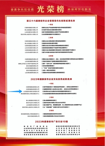 為進一步總結(jié)交流企業(yè)文化建設(shè)的新成果、新經(jīng)驗,介紹企業(yè)文化建設(shè)的新方法、新特點,展示企業(yè)文化建設(shè)的新水平、新成就,經(jīng)市企業(yè)文化優(yōu)秀成果評委會審定,全市10項企業(yè)文化成果獲“2023年度泰安市企業(yè)文化優(yōu)秀成果”獎,其中,一等獎4項。
