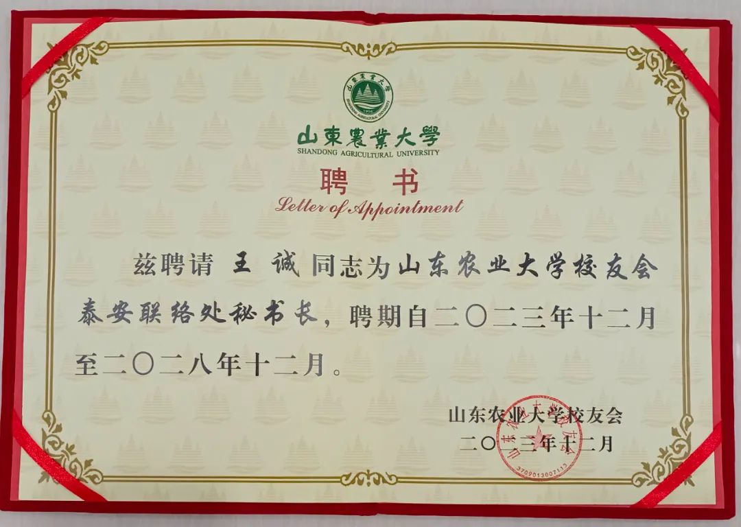 董事長王誠被聘為泰安校友聯(lián)絡(luò)處秘書長