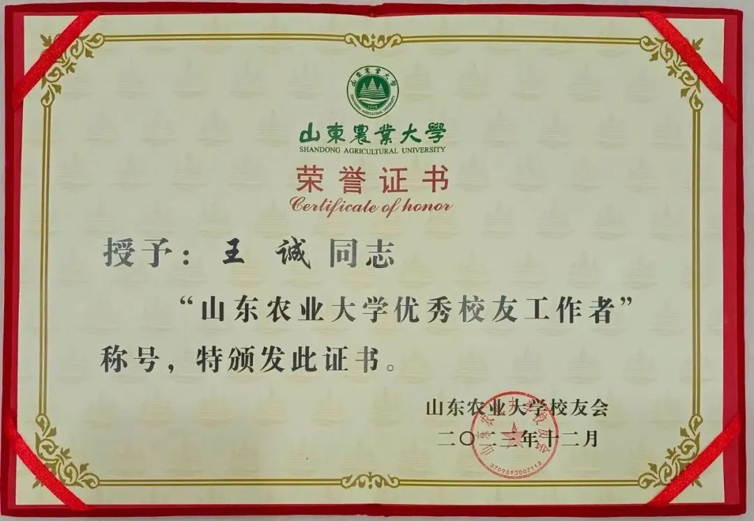 作為山東農(nóng)業(yè)大學(xué)的一名校友,健源生物董事長王誠飲水不忘思源,積極參與到泰安聯(lián)絡(luò)處換屆工作中,擔(dān)任換屆工作籌備組秘書長,本著隆重?zé)崃、?wù)實(shí)節(jié)儉的原則,經(jīng)過明確分工、周密部署、精誠協(xié)作,被山東農(nóng)業(yè)大學(xué)校友會聘請為山東農(nóng)業(yè)大學(xué)校友會泰安聯(lián)絡(luò)處秘書長并授予“山東農(nóng)業(yè)大學(xué)優(yōu)秀校友工作者”榮譽(yù)稱號。