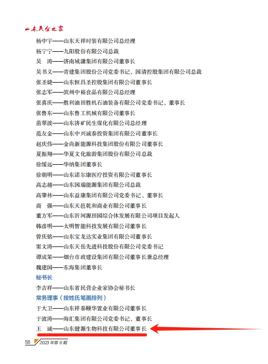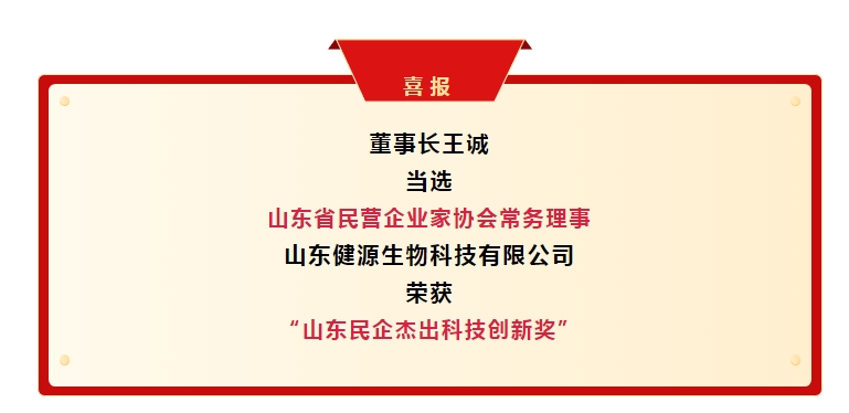 近日,在2023年度山東省民營企業(yè)家協(xié)會表彰評選活動中,經(jīng)山東省民營企業(yè)家協(xié)會三屆十六次會長會議研究,報請協(xié)會三屆五次會員代表大會審議,決定增補山東健源生物科技有限公司董事長王誠為山東省民營企業(yè)家協(xié)會第三屆理事會常務(wù)理事。