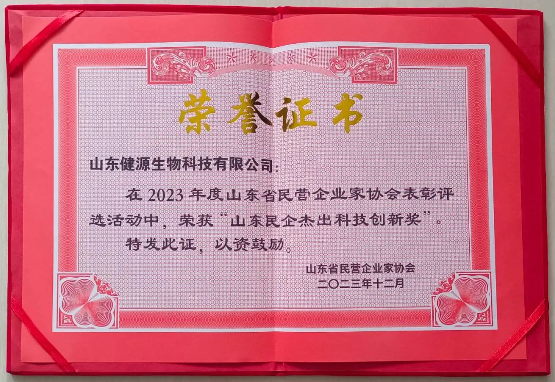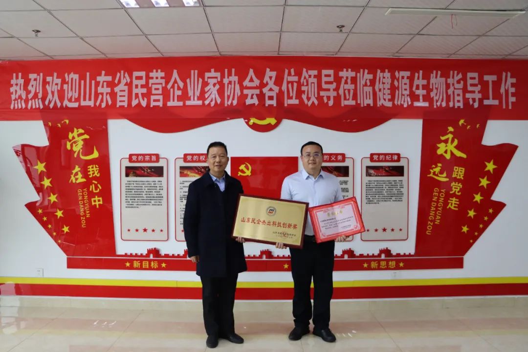 在科技創(chuàng)新的征途上,健源生物再創(chuàng)佳績,榮獲山東省民營企業(yè)家協(xié)會“山東民企杰出科技創(chuàng)新獎”。