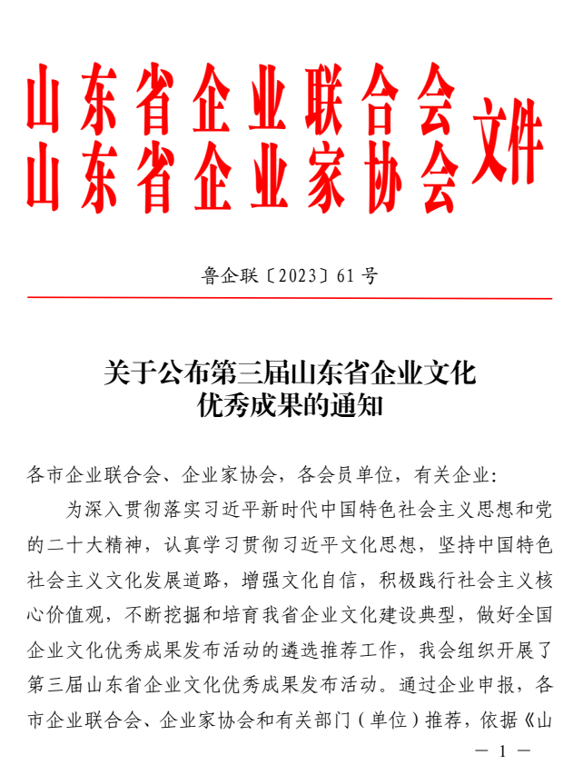本次企業(yè)文化成果評選活動由山東省企業(yè)聯(lián)合會、山東省企業(yè)家協(xié)會主辦,為深入貫徹落實習(xí)近平新時代中國特色社會主義思想和黨的二十大精神,認(rèn)真學(xué)習(xí)貫徹習(xí)近平文化思想,堅持中國特色社會主義文化發(fā)展道路,增強文化自信,積極踐行社會主義核心價值觀,不斷挖掘和培育我省企業(yè)文化建設(shè)典型,做好全國企業(yè)文化優(yōu)秀成果發(fā)布活動的遴選推薦工作。通過推出一批把握文化方向、時代脈搏的企業(yè)文化優(yōu)秀成果,堅定廣大企業(yè)以文化強企之路,充分發(fā)揮企業(yè)文化在企業(yè)發(fā)展中的作用。