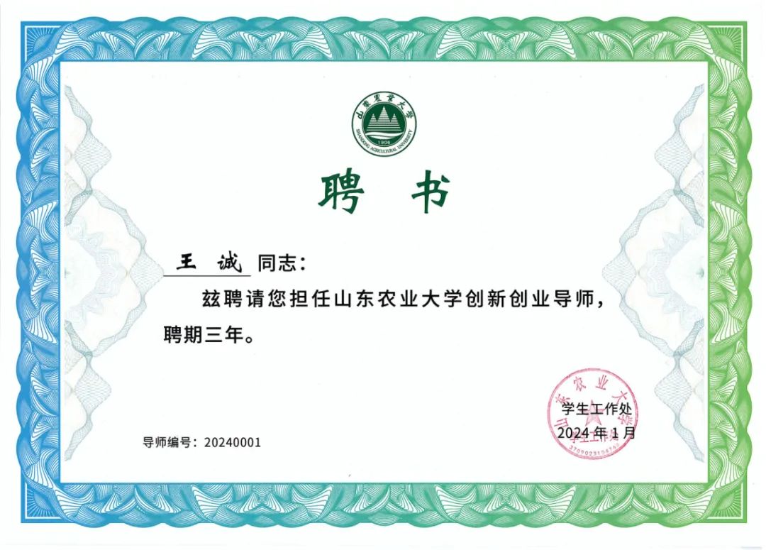 董事長王誠被聘為山東農(nóng)業(yè)大學創(chuàng)新創(chuàng)業(yè)導師