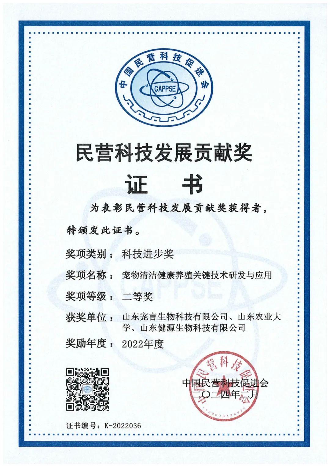 山東健源生物科技有限公司及旗下山東寵言生物科技有限公司聯(lián)合山東農(nóng)業(yè)大學共同完成的“寵物清潔健康養(yǎng)殖關鍵技術研發(fā)與應用”項目榮獲“2022年度民營科技發(fā)展貢獻獎科技進步獎二等獎”。