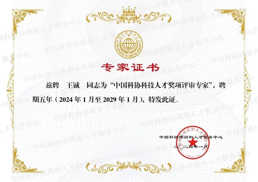 2024年1月被聘請(qǐng)為“中國(guó)科協(xié)科技人才獎(jiǎng)項(xiàng)評(píng)審專家”
