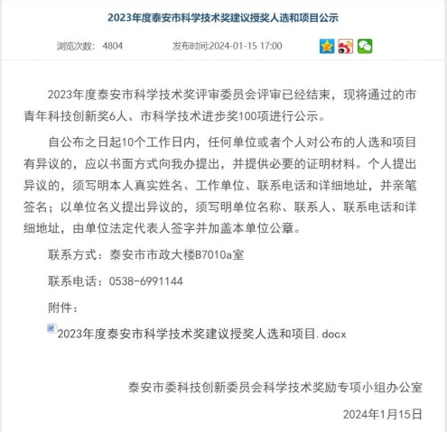 作為項(xiàng)目第一完成人榮獲泰安市科學(xué)技術(shù)進(jìn)步一等獎(jiǎng)