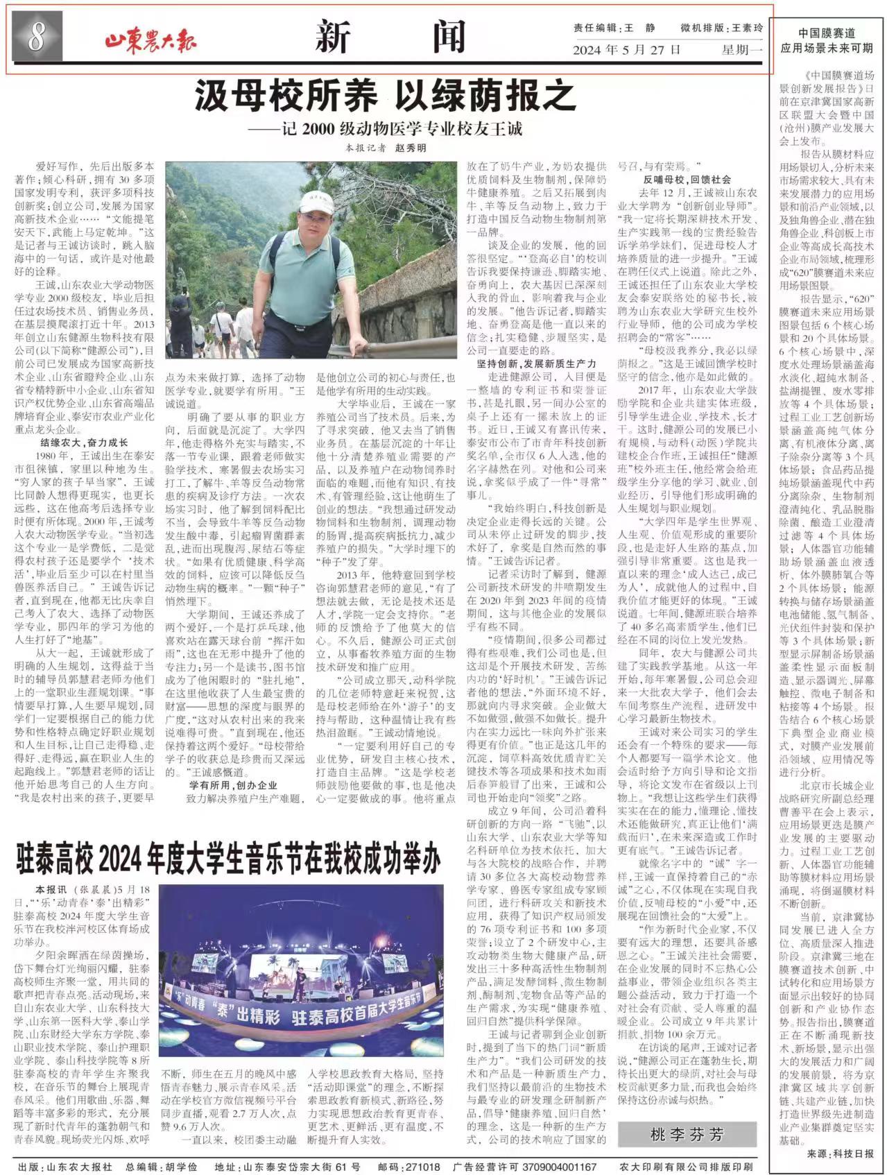發(fā)布時(shí)間:[2024-6-1 17:23:41] 瀏覽量:3113次日前,王誠董事長作為山東農(nóng)業(yè)大學(xué)校友接受《山東農(nóng)大報(bào)》桃李芬芳欄目采訪。報(bào)道發(fā)表在《山東農(nóng)大報(bào)》第1447期第8版,講述了王誠董事長求學(xué)創(chuàng)業(yè)之路,以實(shí)際行動(dòng)反哺母校,先后被山東農(nóng)業(yè)大學(xué)聘為“創(chuàng)新創(chuàng)業(yè)導(dǎo)師”和“研究生校外行業(yè)導(dǎo)師”,擔(dān)任山東畜牧獸醫(yī)學(xué)會(huì)副理事長、山東畜牧獸醫(yī)學(xué)會(huì)反芻動(dòng)物科技專業(yè)委員會(huì)秘書長、副理事長。2023年被聘請(qǐng)為山東農(nóng)業(yè)大學(xué)校友會(huì)泰安聯(lián)絡(luò)處理事會(huì)秘書長,并被授予“優(yōu)秀校友工作者”榮譽(yù)稱號(hào),健源生物是山東農(nóng)業(yè)大學(xué)“校友之家”單位、動(dòng)物科技學(xué)院“教育科研實(shí)踐就業(yè)基地”。