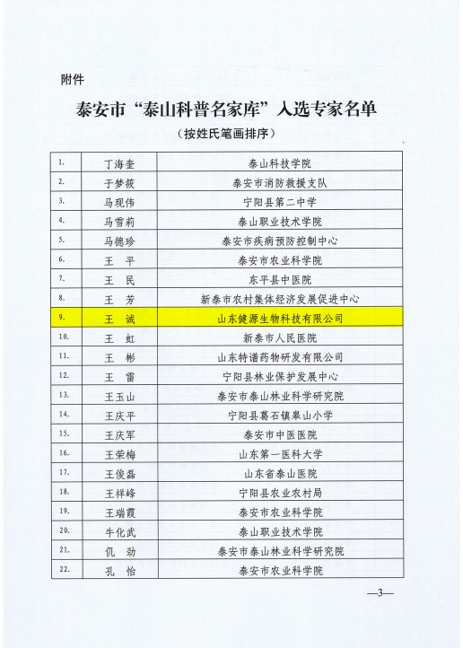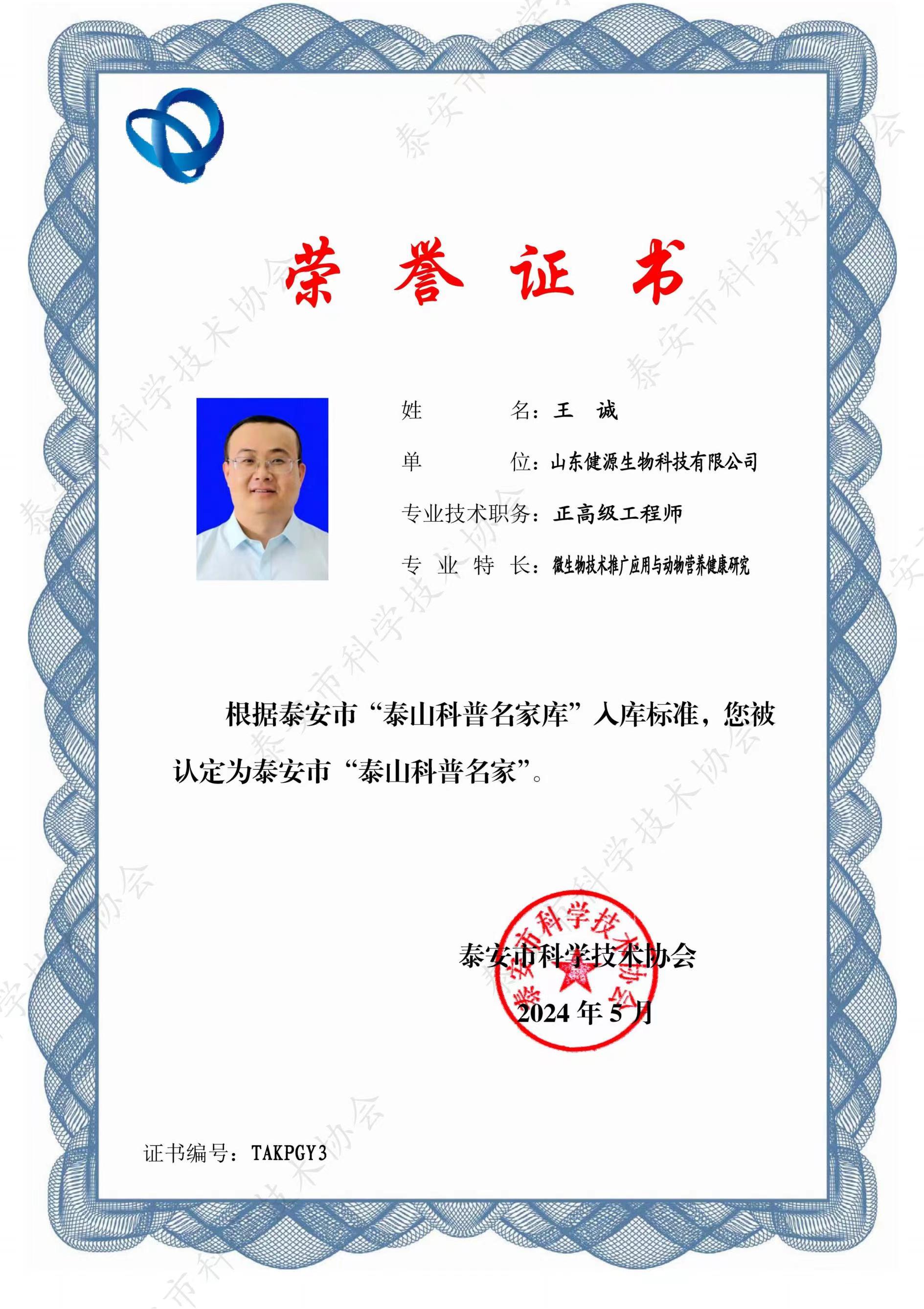 發(fā)布時間:[2024-6-6 16:33:30] 瀏覽量:3031次近日,泰安市科學(xué)技術(shù)協(xié)會公布了泰安市“泰山科普名家?guī)臁比脒x專家名單,根據(jù)泰安市“泰山科普名家?guī)臁比霂鞓?biāo)準(zhǔn),山東健源生物科技有限公司董事長王誠被認(rèn)定為泰安市“泰山科普名家”。