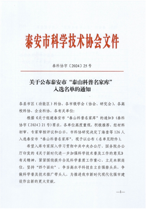 根據(jù)《關(guān)于組建泰安市“泰山科普名家?guī)臁钡耐ㄖ?泰科協(xié)字[2024]21號)要求,泰安市“泰山科普名家?guī)臁痹u選工作經(jīng)過材料初審、專家審核評議和公示等環(huán)節(jié),最終,126人入選泰安市“泰山科普名家?guī)臁薄?/span>