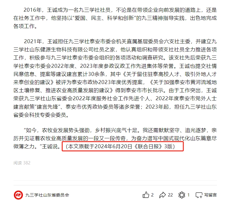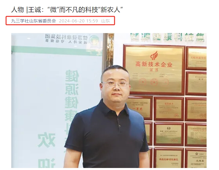 日前,王誠董事長接受了聯(lián)合日報記者的采訪,報道發(fā)表在2024年6月20日《聯(lián)合日報》3版,講述了王誠董事長作為“新農(nóng)人”,20多年來深耕微生態(tài)領(lǐng)域,以高活性益生菌符合生物制劑技術(shù)為基點(diǎn),從飼草料高效青貯、動物全消化道功能調(diào)控、養(yǎng)殖環(huán)境污染控制等方面開展全方位的發(fā)明創(chuàng)新,用專有發(fā)明技術(shù)助力農(nóng)牧業(yè)高質(zhì)量發(fā)展。而作為一名九三學(xué)社社員,王誠董事長堅持以“愛國、民主、科學(xué)和創(chuàng)新”的九三精神指導(dǎo)實(shí)踐,出色地完成各項(xiàng)工作。該報道同時被九三學(xué)社山東省委員會轉(zhuǎn)載報道。