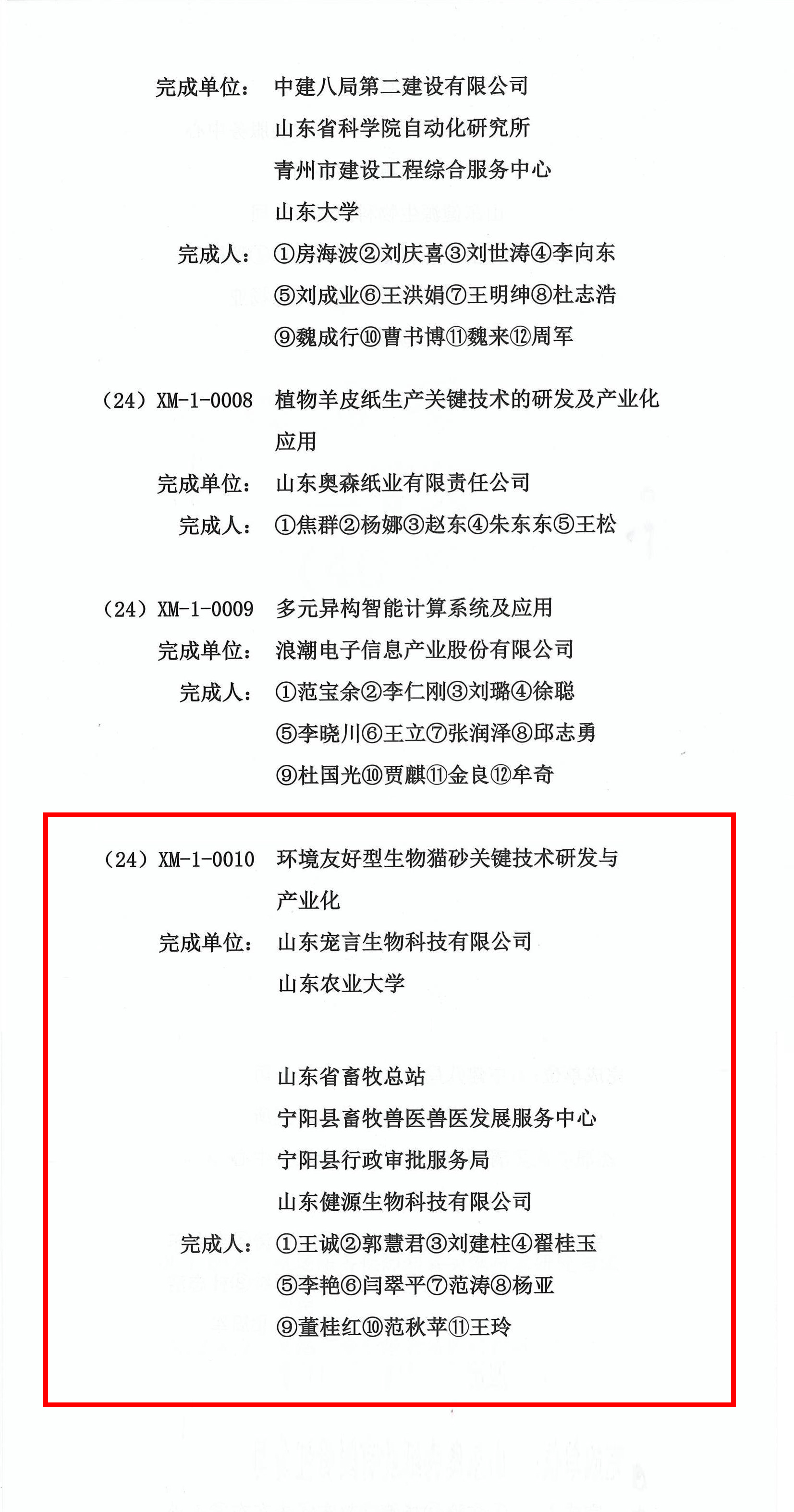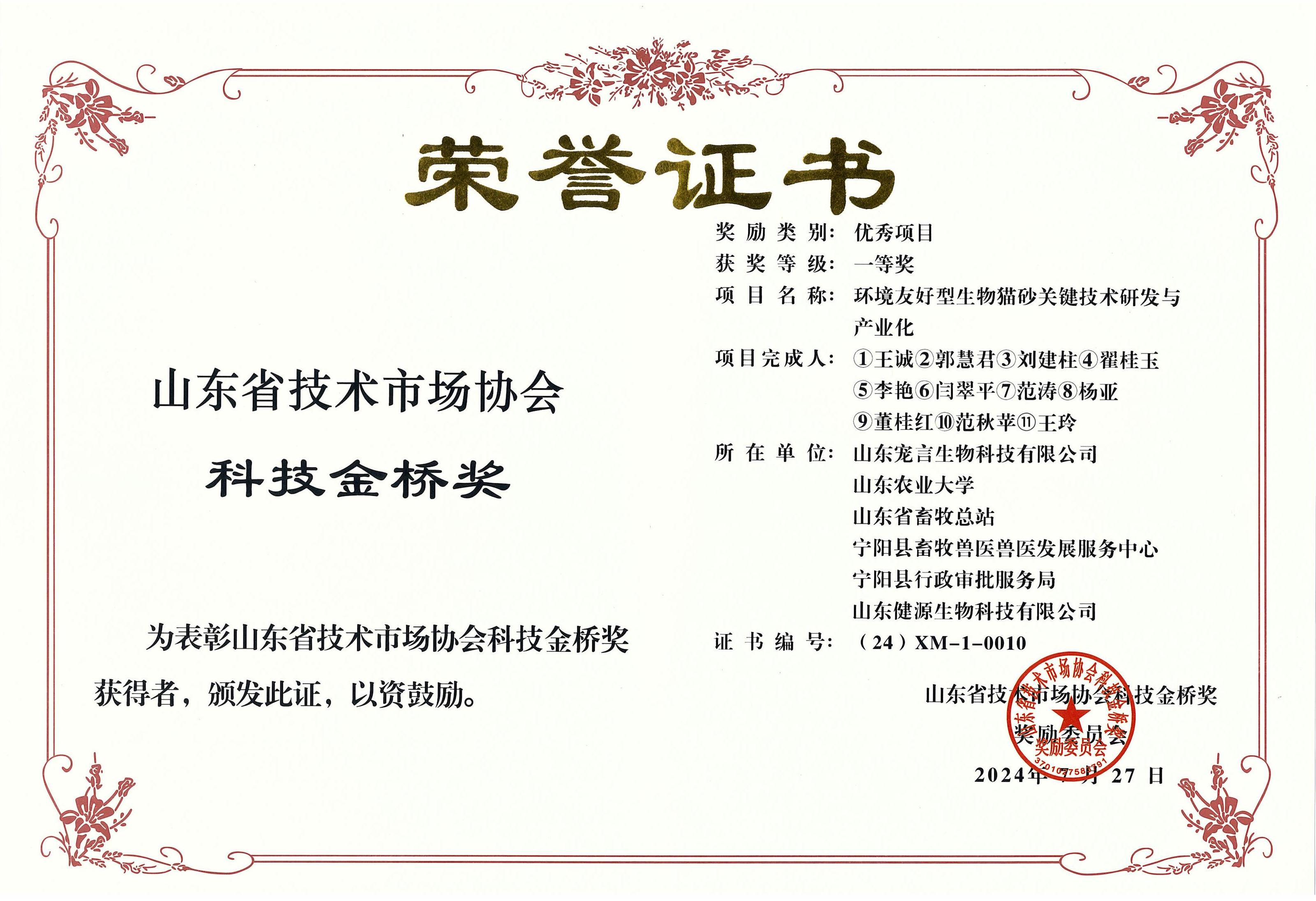 8月30日,2024年度山東省科技金橋獎表彰獎勵大會暨山東創(chuàng)新驅(qū)動發(fā)展高端論壇在山東省干部學(xué)院成功舉辦。山東健源生物科技有限公司與子公司山東寵言生物科技有限公司共同完成的“環(huán)境友好型生物貓砂關(guān)鍵技術(shù)研發(fā)與產(chǎn)業(yè)化”項(xiàng)目,經(jīng)過專業(yè)組評審、評審委員會評審、獎勵委員會終審,最終榮獲山東省技術(shù)市場協(xié)會科技金橋獎優(yōu)秀項(xiàng)目一等獎。