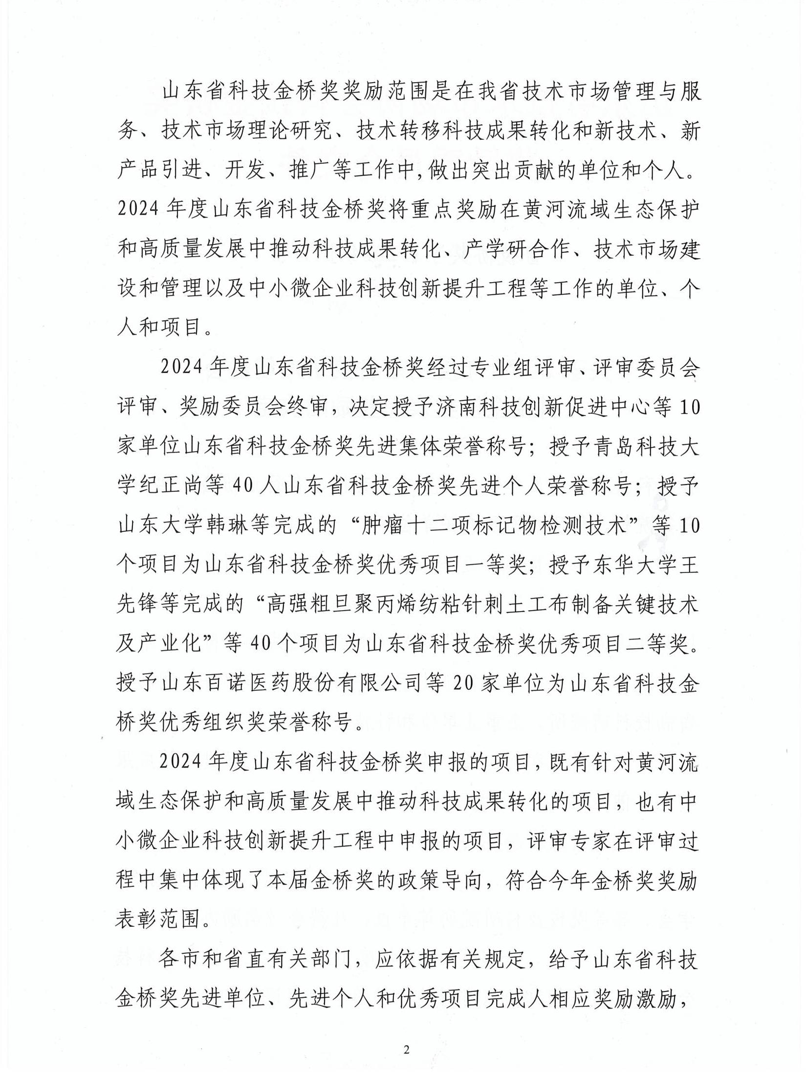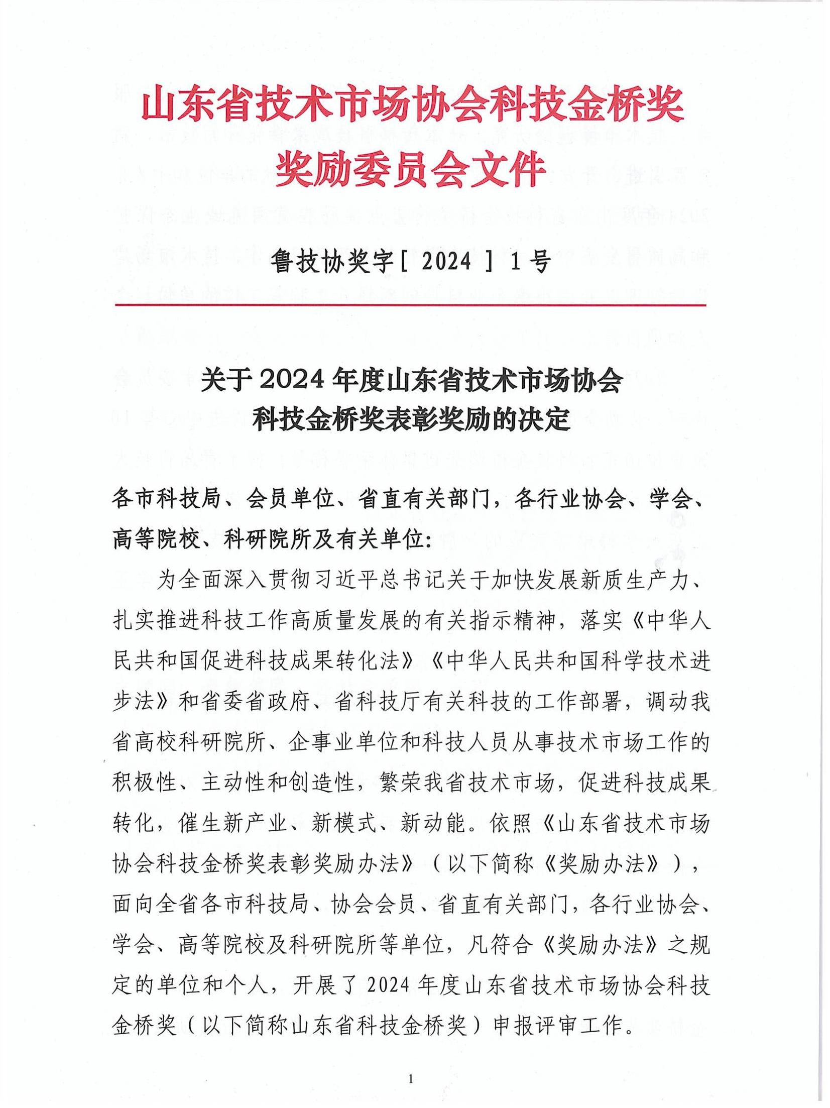 科技金橋獎是山東省科技廳備案的省內(nèi)技術(shù)市場領(lǐng)域最高獎項(xiàng),本屆金橋獎重點(diǎn)獎勵在黃河流域生態(tài)保護(hù)和發(fā)展新質(zhì)生產(chǎn)力中推動科技成果轉(zhuǎn)化、產(chǎn)學(xué)研合作以及為我省科技大市場建設(shè)中做出突出貢獻(xiàn)等工作的單位、個人和項(xiàng)目,共評出50個優(yōu)秀項(xiàng)目,其中一等獎10個。