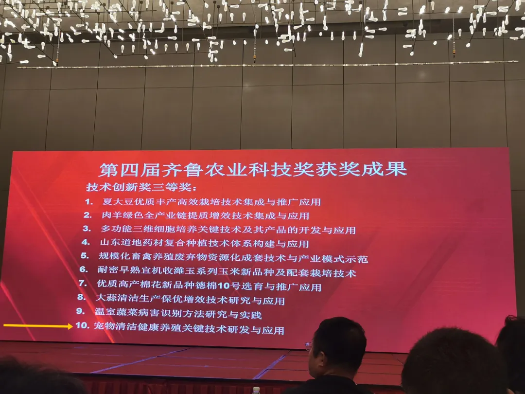 8月30日,第四屆齊魯農(nóng)業(yè)科技獎獎勵大會暨第二屆青年學術(shù)論壇在濟南召開,評選出77項2023年度齊魯農(nóng)業(yè)科技獎。山東健源生物科技有限公司與子公司山東寵言生物科技有限公司共同完成的“寵物清潔健康養(yǎng)殖關(guān)鍵技術(shù)研發(fā)與應(yīng)用”項目榮獲2023年度齊魯農(nóng)業(yè)科技獎技術(shù)創(chuàng)新獎三等獎。