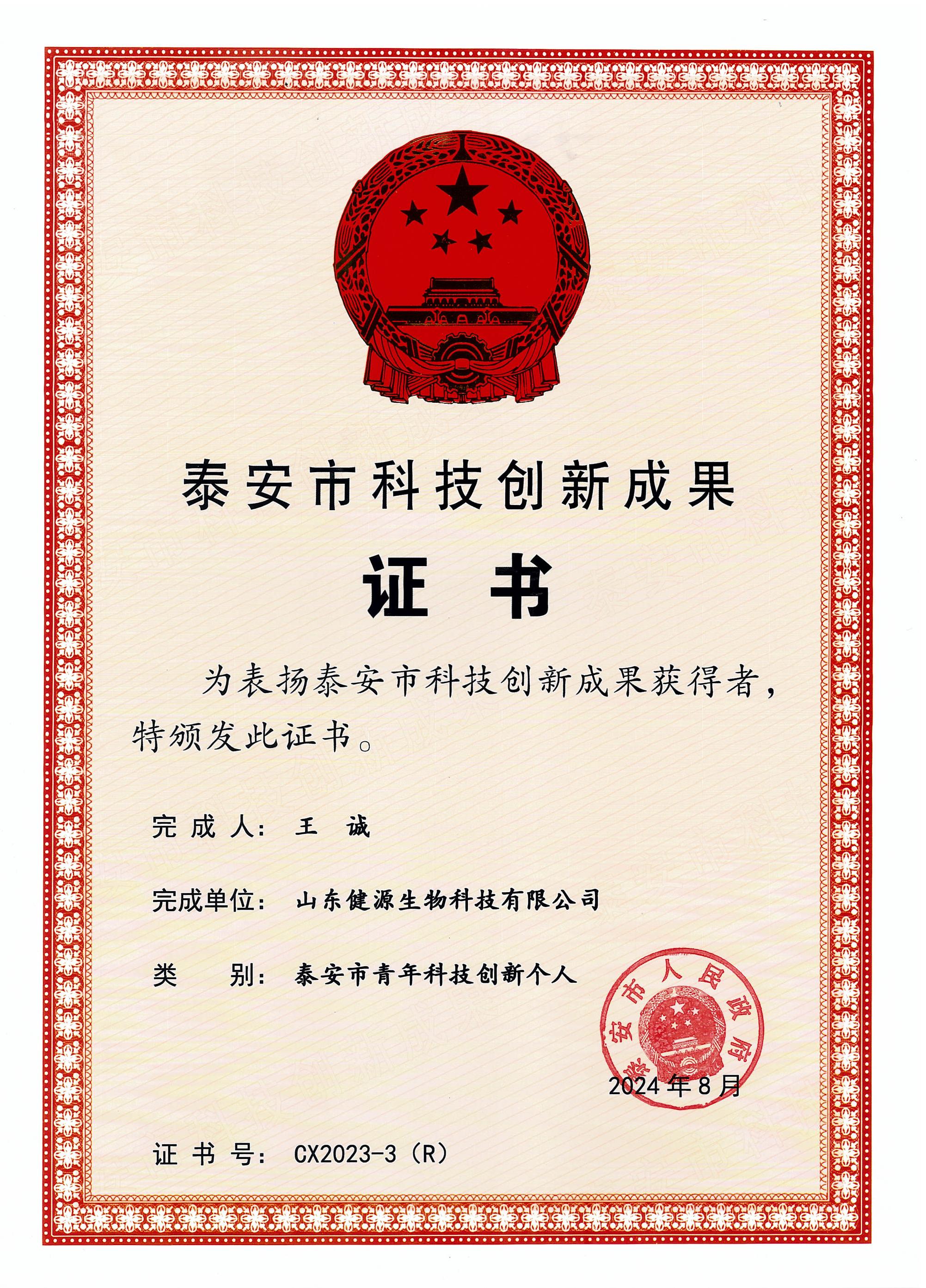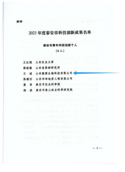 會(huì)上宣讀了《泰安市獲2023年度國(guó)家、省科學(xué)技術(shù)獎(jiǎng)項(xiàng)目名單》和《泰安市人民政府關(guān)于公布2023年度泰安市科技創(chuàng)新成果名單的通知》,為2023年度省科學(xué)技術(shù)獎(jiǎng)獲獎(jiǎng)代表及市科技創(chuàng)新成果完成人代表頒發(fā)證書(shū)。山東健源生物科技有限公司董事長(zhǎng)王誠(chéng)榮獲泰安市青年科技創(chuàng)新個(gè)人。