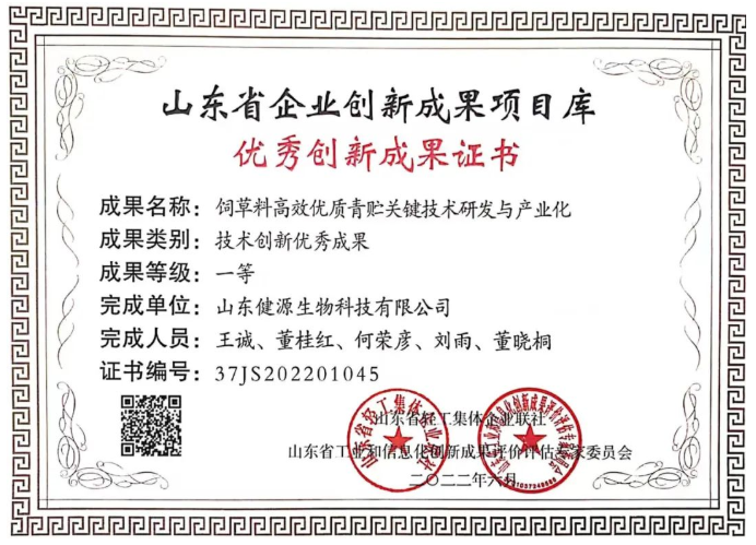 2022-7-15 山東健源生物榮獲山東省企業(yè)創(chuàng)新成果項目庫 “技術(shù)創(chuàng)新優(yōu)秀成果一等獎”