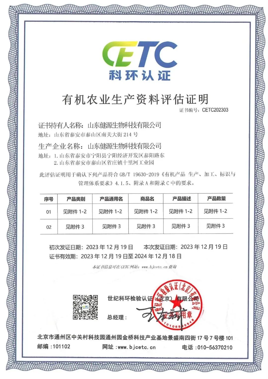 2024-1-3 健源生物高活性生物系列產(chǎn)品通過“有機農(nóng)業(yè)生產(chǎn)資料評估證明”認(rèn)證