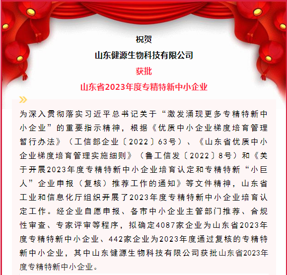 2023-5-15 山東健源生物獲批山東省2023年度專精特新中小企業(yè)