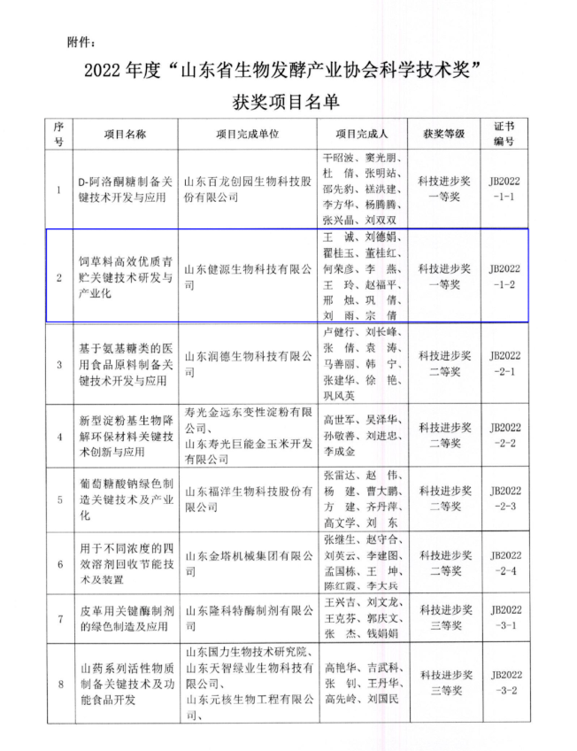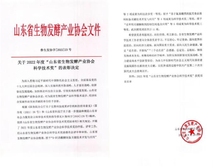 按照《山東省生物發(fā)酵產(chǎn)業(yè)協(xié)會(huì)科學(xué)技術(shù)獎(jiǎng)獎(jiǎng)勵(lì)章程》相關(guān)規(guī)定,開(kāi)展2022年度山東省生物發(fā)酵產(chǎn)業(yè)協(xié)會(huì)科學(xué)技術(shù)獎(jiǎng)的申報(bào)、評(píng)審工作,經(jīng)山東省生物發(fā)酵產(chǎn)業(yè)協(xié)會(huì)科學(xué)技術(shù)獎(jiǎng)勵(lì)委員會(huì)評(píng)審和審核,山東省生物發(fā)酵產(chǎn)業(yè)協(xié)會(huì)批準(zhǔn),授予山東健源生物科技有限公司成果為科技進(jìn)步獎(jiǎng)一等獎(jiǎng)。