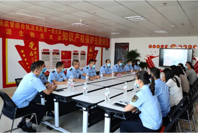 服務(wù)經(jīng)濟發(fā)展,賦能強市建設(shè)。2022年9月2日,山東健源生物黨支部與泰安市市場監(jiān)管綜合執(zhí)法支隊黨支部聯(lián)合開展"知識產(chǎn)權(quán)保護主題黨日"活動,增強企業(yè)知識產(chǎn)權(quán)保護意識。泰安市市場監(jiān)管綜合執(zhí)法支隊副支隊長孫鳳明、任常平帶領(lǐng)第一支部12名黨員參加,山東健源生物行政副總經(jīng)理王玲、技術(shù)研發(fā)部主任董桂紅等相關(guān)部門負責(zé)人一同參與活動。