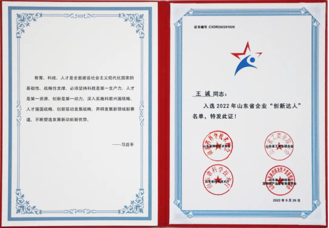 祝賀山東健源生物董事長王誠榮獲2022年山東省企業(yè)“創(chuàng)新達人”稱號
