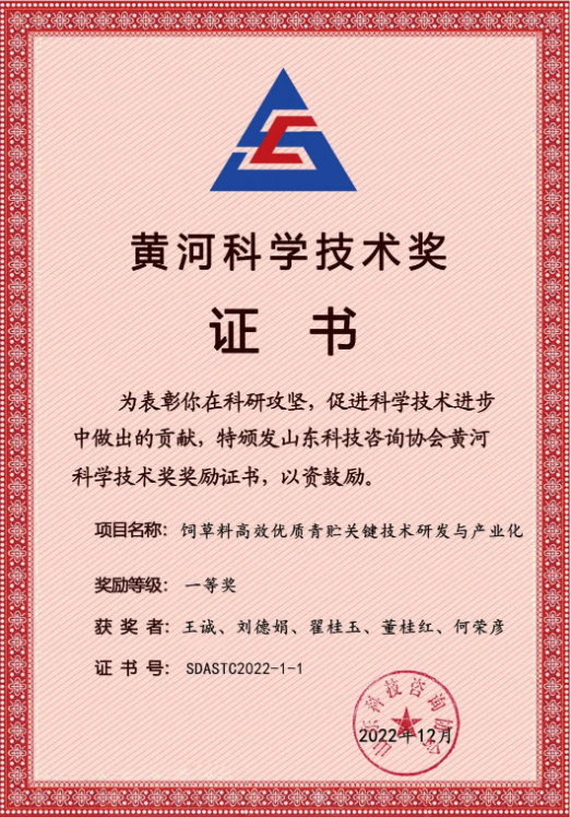 2022年12月山東科技咨詢協(xié)會公布了2022年黃河科學(xué)技術(shù)獎評審結(jié)果的公告,經(jīng)專家評審會評審,現(xiàn)批準(zhǔn)28個項目獲2022年山東科技咨詢協(xié)會黃河科學(xué)技術(shù)獎,其中一等獎3人,二等獎5人,三等獎20人。山東健源生物科技有限公司申報的《飼草料高效優(yōu)質(zhì)青貯關(guān)鍵技術(shù)研發(fā)與產(chǎn)業(yè)化》項目榮獲一等獎。