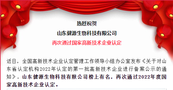 祝賀山東健源生物再次通過(guò)國(guó)家高新技術(shù)企業(yè)認(rèn)定