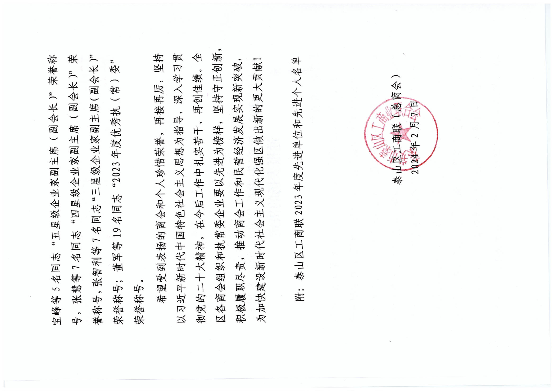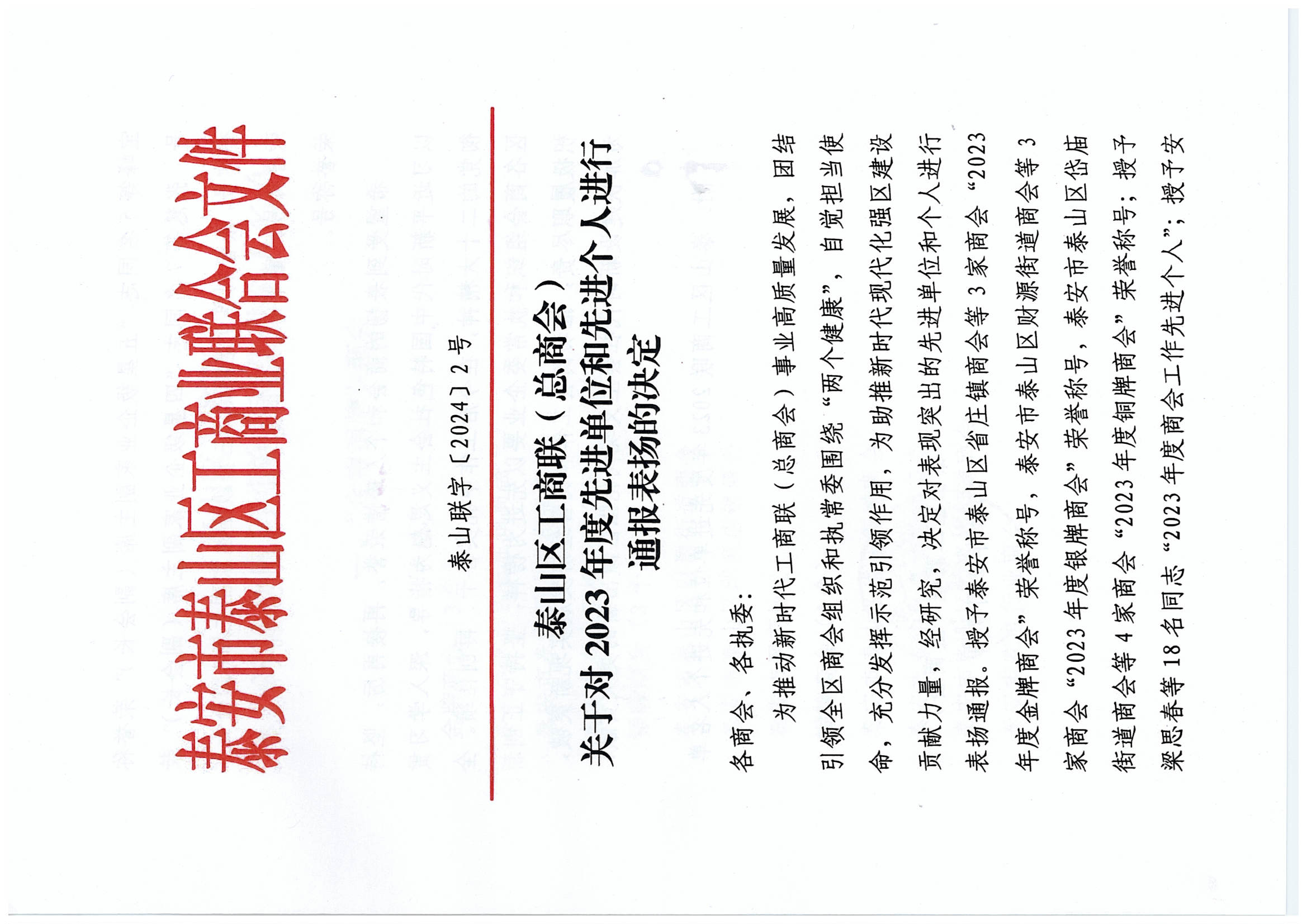 董事長(zhǎng)王誠(chéng)榮獲泰山區(qū)工商聯(lián)“2023年度優(yōu)秀執(zhí)(常)委”榮譽(yù)稱號(hào)